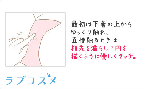 ただ指先を振動させるだけでなく、指をクリトリス周辺にそって滑らせたり、小陰唇など軽く周囲を摘んでみたりするテクニックもOKです。ただし、あくまで優しく、刺激を与えすぎないこと。