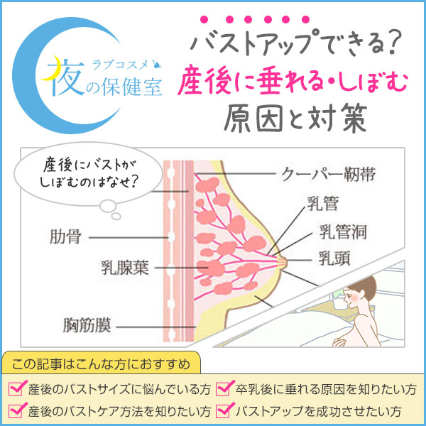 授乳中のバストサイズをそのまま維持するのは難しいのですが、産後のバストアップケアをすることで、卒乳後に胸がしぼんだ状態のペチャパイにならないケア方法があります。女性らしいバストを保つためにも、そして夫婦のスキンシップのためにも、産後のバストケアは肝心です。
