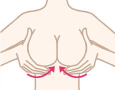 親指を使って左右の乳房を持ちあげるように天渓から内側に押します。左右のバストで同時にゆっくり行うことがポイントです。毎日天渓を刺激して乳腺を発達させボリュームアップを目指してみましょう。