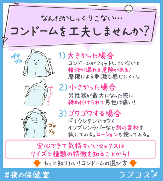 SEXの最中にコンドームがぶかぶかでずれる…、彼がコンドームをつけるとサイズが小さいのかきついと痛がる…そんな時はコンドームのサイズを見直してみるといいかもしれません。