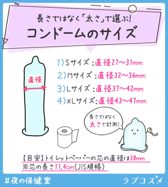なお、コンドームのLサイズの定義についても知っておくといいでしょう。トイレットペーパーの芯の直径が38㎜(±1㎜)ですが、それより大きかったらLサイズの目安です。具体的な直径の長さは、Lサイズ=37~42mmとなります。