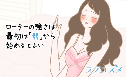 ローターは弱から始めるのが基本的な使い方です。「早く気持ちよくなりたい」「強い刺激が欲しい」と強から始めてしまうと意外と刺激が強すぎて痛みを感じたり、焦らされ感がなく、さらにはイッたのに何となく満足できないと感じてしまう場合があります