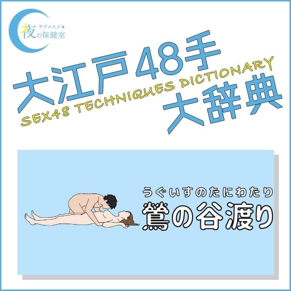 ウグイスが胸からデリケートゾーンへ飛び立とうとする時、男性が女性にまたがってシックスナインの姿勢になると、鶯の谷渡りから『椋鳥(むくどり)』に変化。男性が仰向けになって女性が上になれば『二つ巴(ふたつともえ)』に。