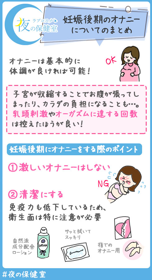 リラックス効果もあるので、変にガマンしてカラダにストレスをかけてしまうよりは、適度にカラダの様子をみながら妊娠後期もオナニーをしたほうが、赤ちゃんにもカラダにも良いとも言えます。