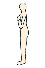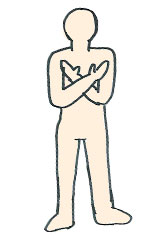 両足を肩幅に開き、手は胸を覆うようにクロスさせます。
