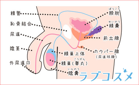 精嚢とともに、精液の一部であり精子の運動性を高める分泌物「精漿(せいしょう)」を作る役割を持つ組織です。膀胱の下の位置にあり、栗の実のような形をしています。前立腺も、刺激されると快感を得られる部位の1つです。直腸から刺激することが可能です。