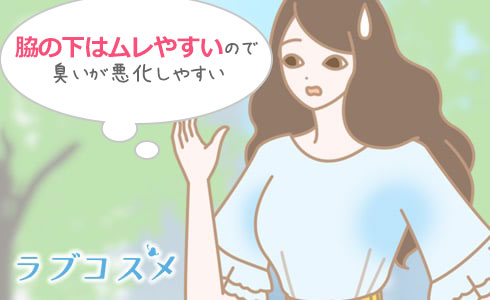 また、両腕で塞がれている腋の下は湿った状態なので蒸れやすく、また腋のシワの部分に垢や老廃物もたまりやすいので、臭いが悪化してしまいます。