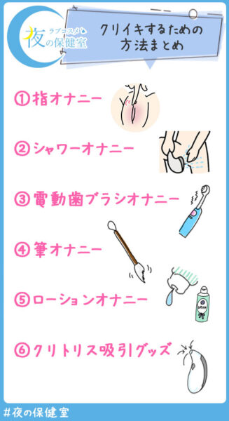 クリイキの方法として最も一般的なのは「指オナニー」ですが、他にもいくつかの具体的な方法があります。そのバリエーションをご紹介します。