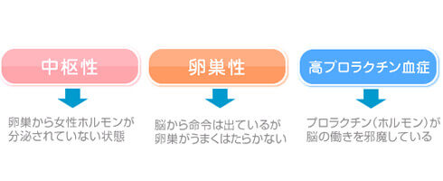 脳が、卵巣にむけて「女性ホルモンを出しなさい!」という命令を出していないために、結果として卵巣から女性ホルモンが分泌されていない状態です。