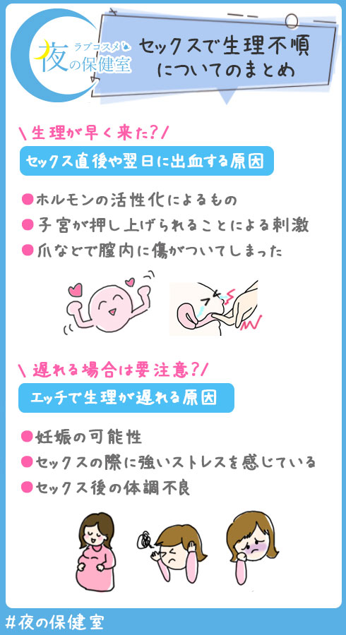 セックスによってホルモンが活性化し、子孫を残そうと排卵が早まることで、生理も早まることがあります。