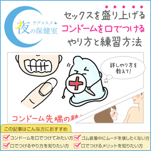 また、口に咥えるようにしてコンドームを着ける場合はうっかり歯を立てることでゴムを傷つけてしまう可能性がありますので、絶対に歯を立てることなく、唇で上手にはさむことによってゴムをペニスにかぶせるようにすると安全に装着することができます。