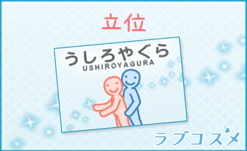 バリエーションの多い立位ですが、48手では対面立位が「立ち鼎(たちかなえ)」、背面立位(立ちバック)がうしろやぐら(後櫓)」 という名前で存在しています。また48手ではなく「裏48手」になるのですが、駅弁にあたる「櫓立ち」もあります。是非それぞれの紹介ページを参考に、沢山の立位をマスターしてみてくださいね。