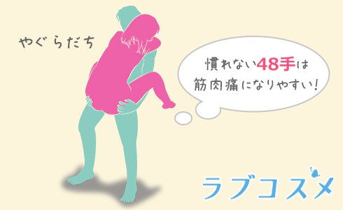 普段は正常位やバック、騎乗位など基本的な体位を楽しんでいるカップルが、新しく48手などにチャレンジするときには要注意です。慣れない体位では挿入やピストン運動がうまくかみ合わないことも多く、無理な体の曲げ伸ばしによって筋肉痛が出やすくなるでしょう。