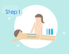 彼をうつぶせに寝かせて、背中にローションを垂らします。背中からお尻へ、手のひら全体を使って、包み込むようにマッサージ。
