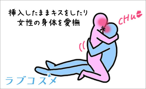 対面座位はお互いの顔を見ながら挿入を行うことができ、なおかつふたりの距離も密着しているためキスや愛撫がしやすい、という特徴があります。