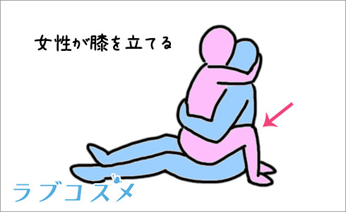 対面座位の簡単なバリエーションの一つ目は「女性が膝を立てる」ものになります。布団に足の裏を付けた状態で抱っこのような体勢をとり、前後に腰を動かすことでGスポットを効率的に刺激します。