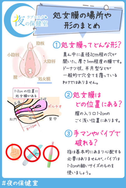 処女膜は膣を横から見た時に膣口から入って1~2cmと、かなり浅い位置にあります。そのため、性交経験のない女性が手鏡で女性器を観察してみると、ぎりぎり処女膜の襞が見える人もいるようです。形や厚さは個人差が大きいですが、大体1mm程度の厚さで半月型やドーナツ状だと言われています。